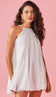 Vestido curto amplo confeccionado em crepe leve com forro. Possui decote halter frente única, com alcinhas trançadas em toda a cava para amarrar no pescoço, tiras para amarrar nas costas, uma mais larga e outra fina, além de recortes no decote com nesgas que dão um lindo movimento esvoaçante para a peça.