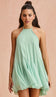 Vestido curto amplo confeccionado em crepe leve com forro. Possui decote halter frente única, com alcinhas trançadas em toda a cava para amarrar no pescoço, tiras para amarrar nas costas, uma mais larga e outra fina, além de recortes no decote com nesgas que dão um lindo movimento esvoaçante para a peça.