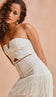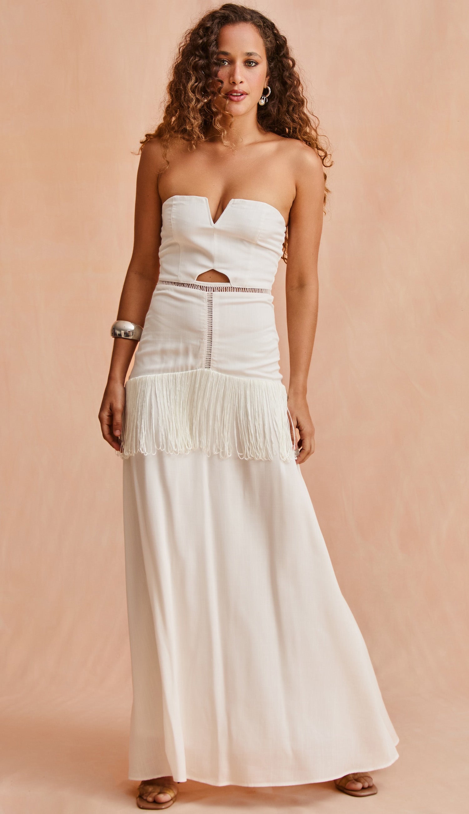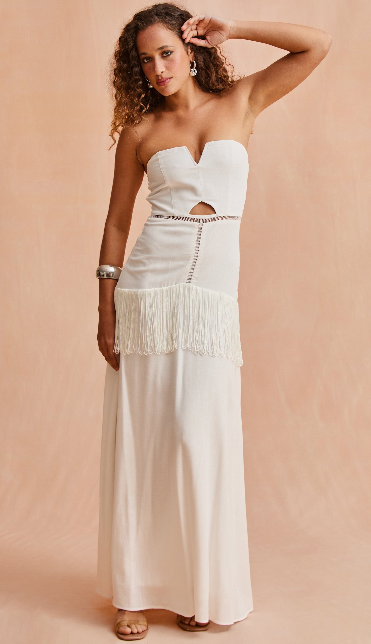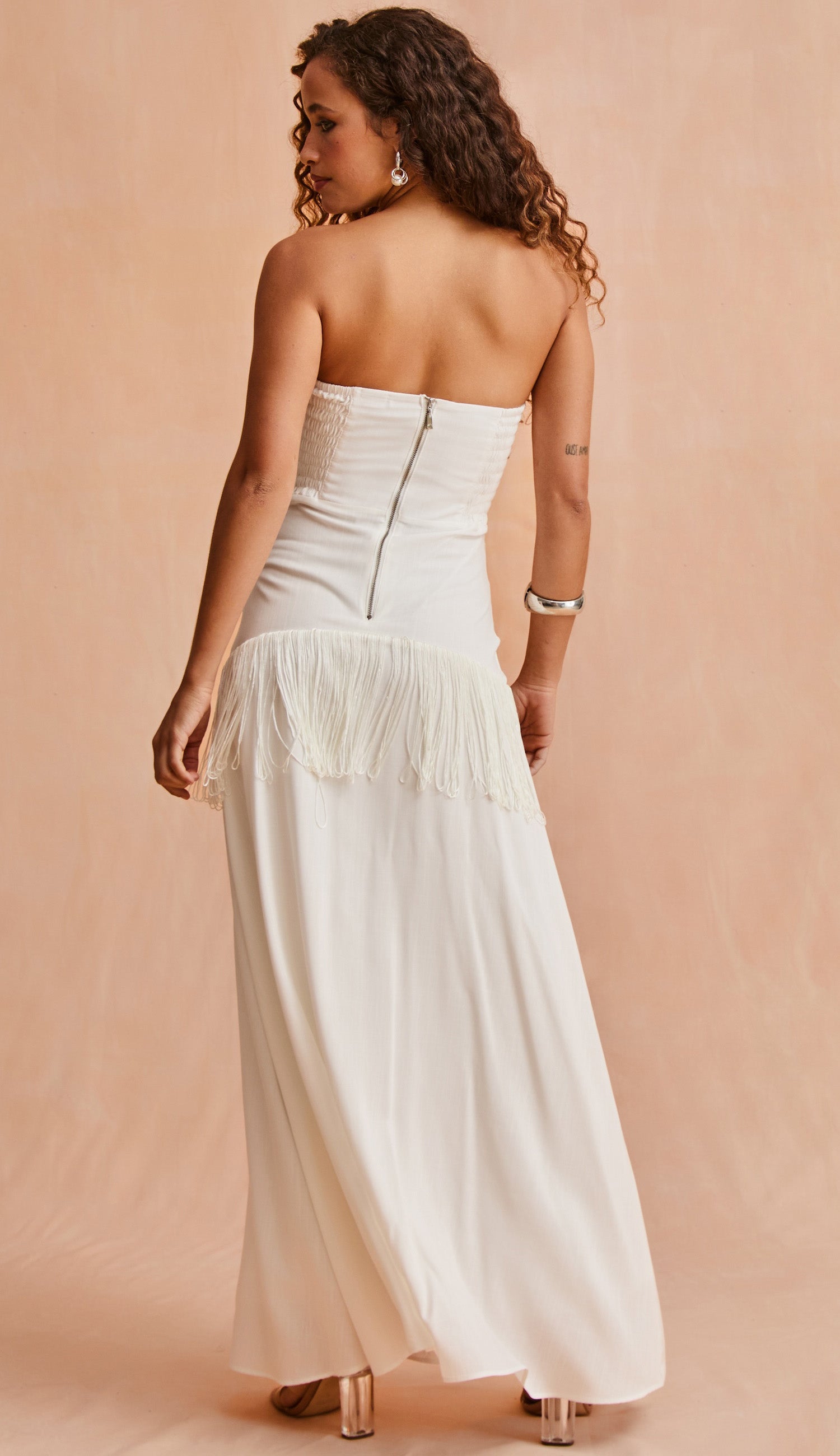 Vestido longuete sem mangas, confeccionado em viscose com toque e aspecto de linho. Possui forro na saia, tecido duplo no busto para não ficar transparente, decote reto com aberturinha em V estruturada no centro, recortes que modelam a peça, pequeno vazado frontal, lastex franzido nas laterais das costas, aplicação de entremeio logo abaixo do busto e no centro da saia, recorte com aplicação de franjas no quadril, saia em A e fechamento traseiro por zíper de metal com pingente que tem a conchinha da Laguna gravada.
