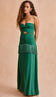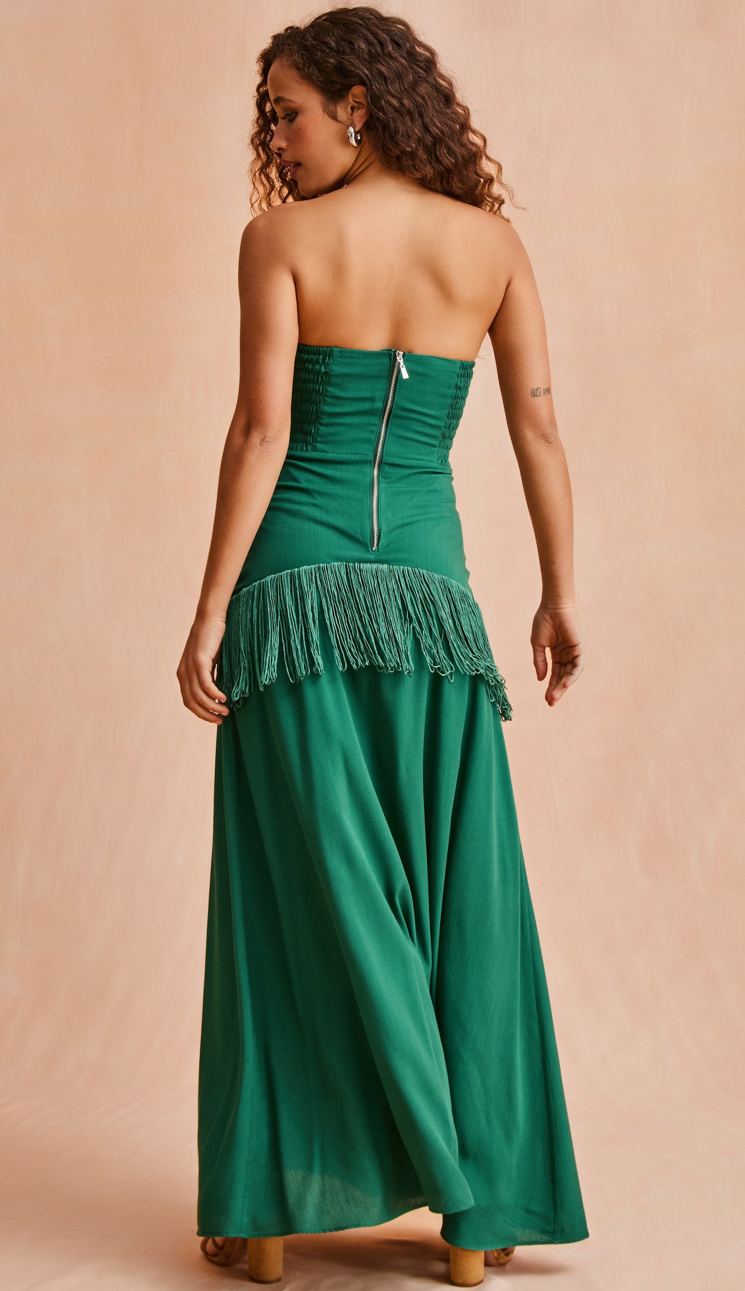 Vestido longuete sem mangas, confeccionado em viscose com toque e aspecto de linho. Possui forro na saia, tecido duplo no busto para não ficar transparente, decote reto com aberturinha em V estruturada no centro, recortes que modelam a peça, pequeno vazado frontal, lastex franzido nas laterais das costas, aplicação de entremeio logo abaixo do busto e no centro da saia, recorte com aplicação de franjas no quadril, saia em A e fechamento traseiro por zíper de metal com pingente que tem a conchinha da Laguna gravada.