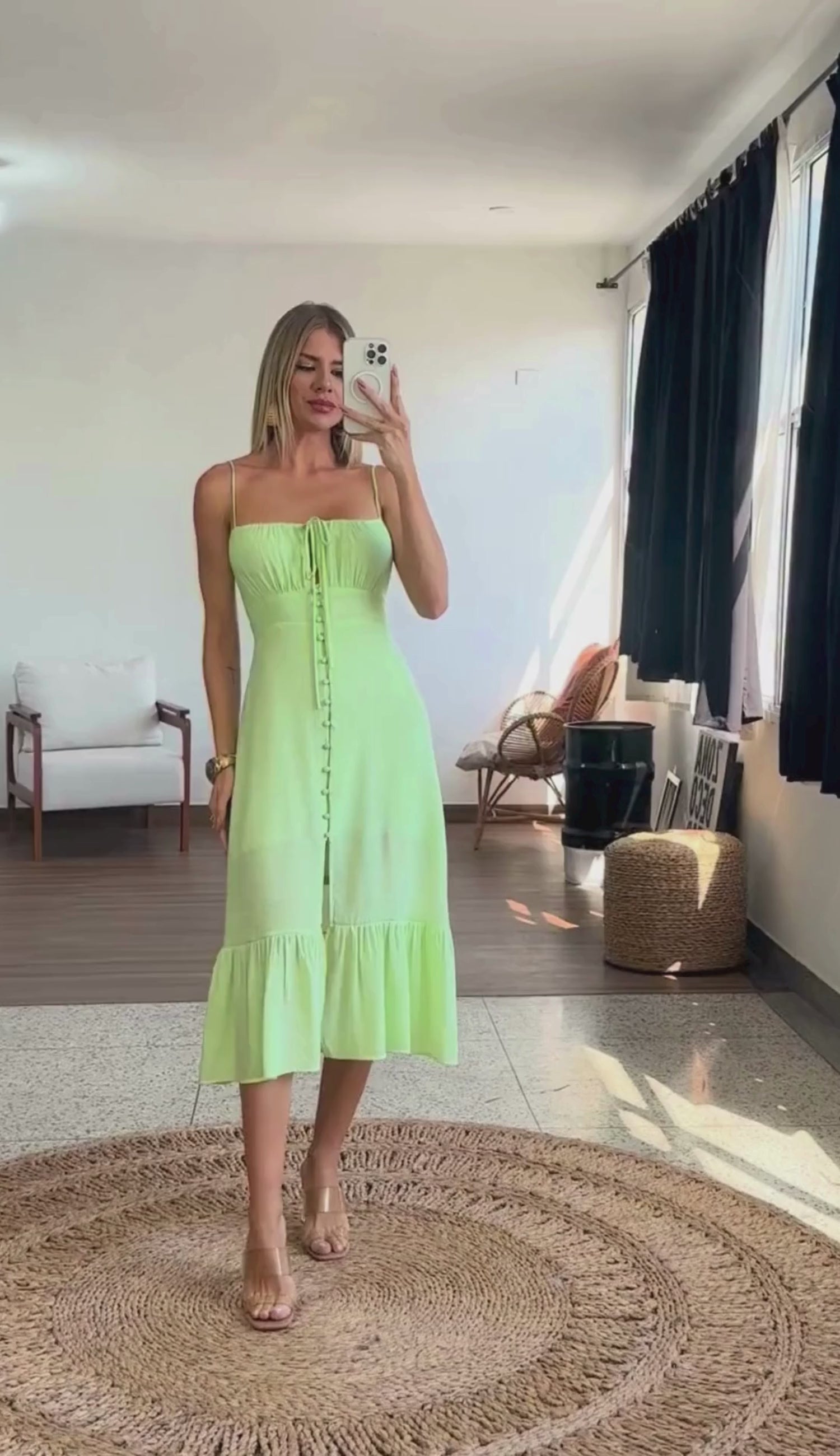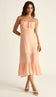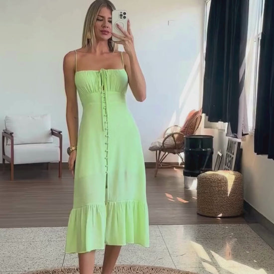 Vestido midi com forro confeccionado em poliviscose texturizado com aspecto de linho. Possui alças finas e reguláveis. Franzido no busto com tirinha para amarrar. Possui fechamento por botões esmaltados e fenda frontal. Lastex franzido nas costas.