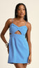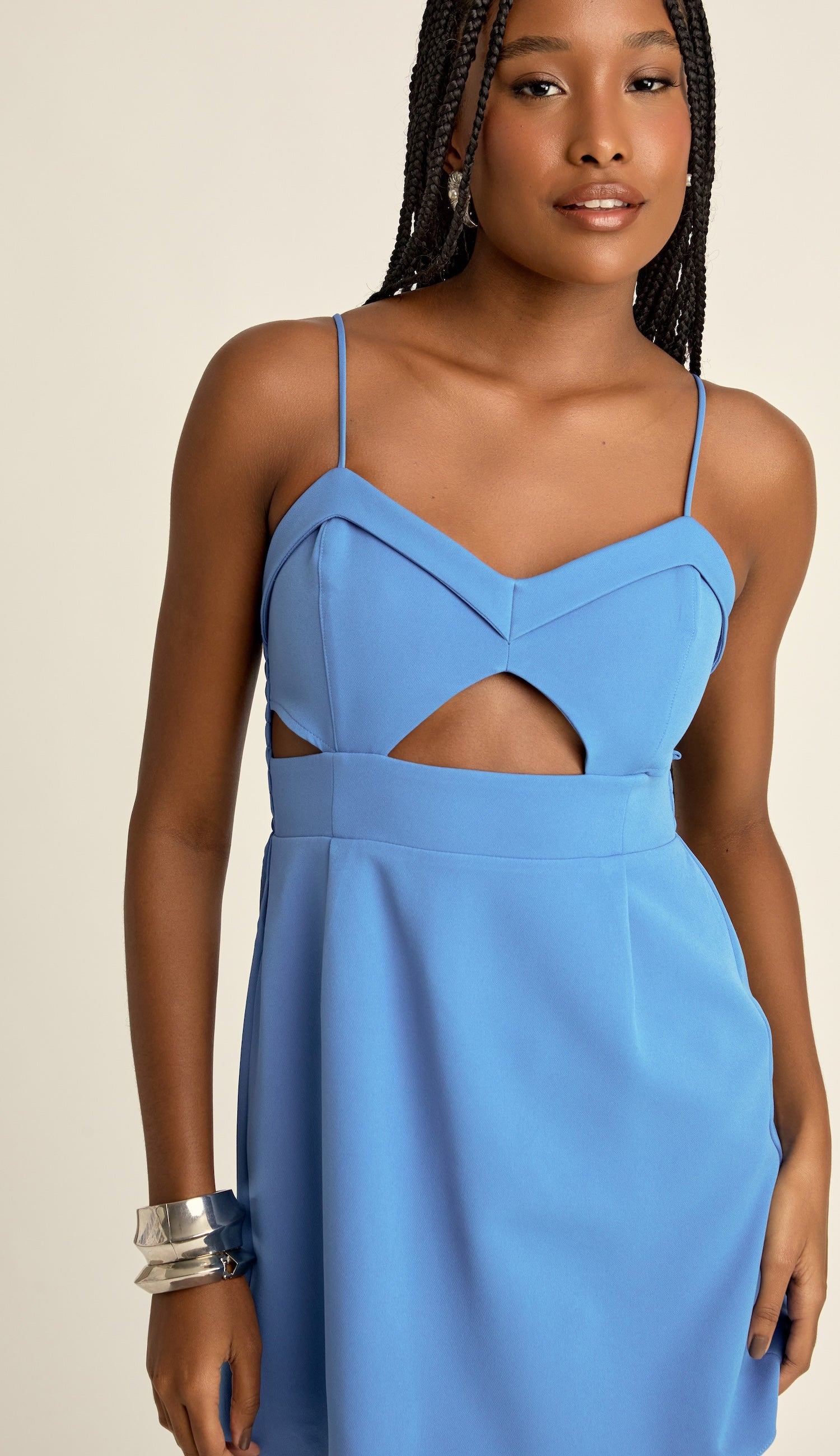 Vestido curto confeccionado em crepe de alfaiataria com forro na saia. Possui decote coração com pala dobrada e recortes que modelam o busto; alcinhas reguláveis; lastex nas costas para maior conforto; recortes vazados nas laterais e na frente, na região da cintura; com pala logo abaixo e preguinhas na saia, que é mais soltinha.
