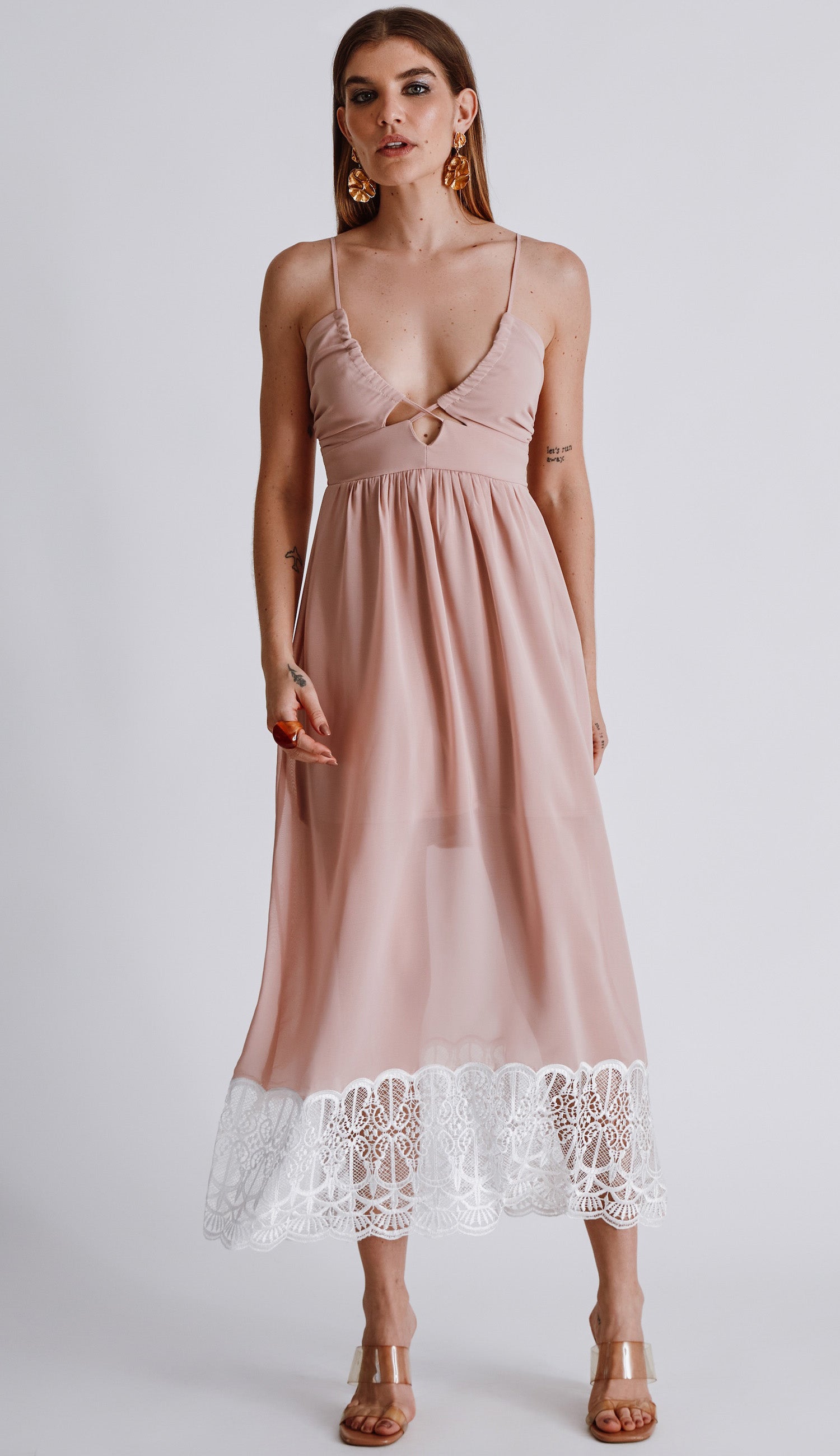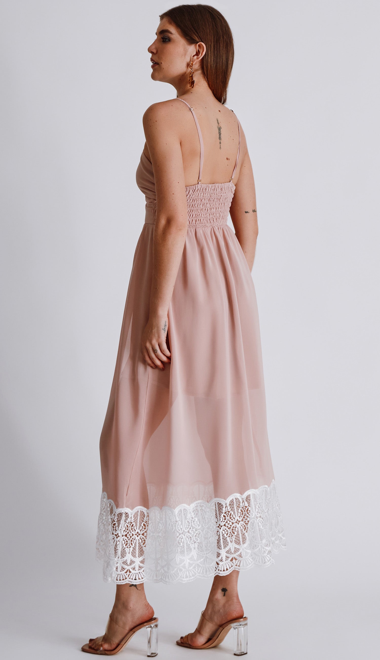 Vestido midi confeccionado em chiffon com forro. Possui decote aberto com alcinhas embutidas reguláveis até as costas, pala na cintura com franzidinhos na saia, renda larga na barra e lastex franzido nas costas.