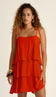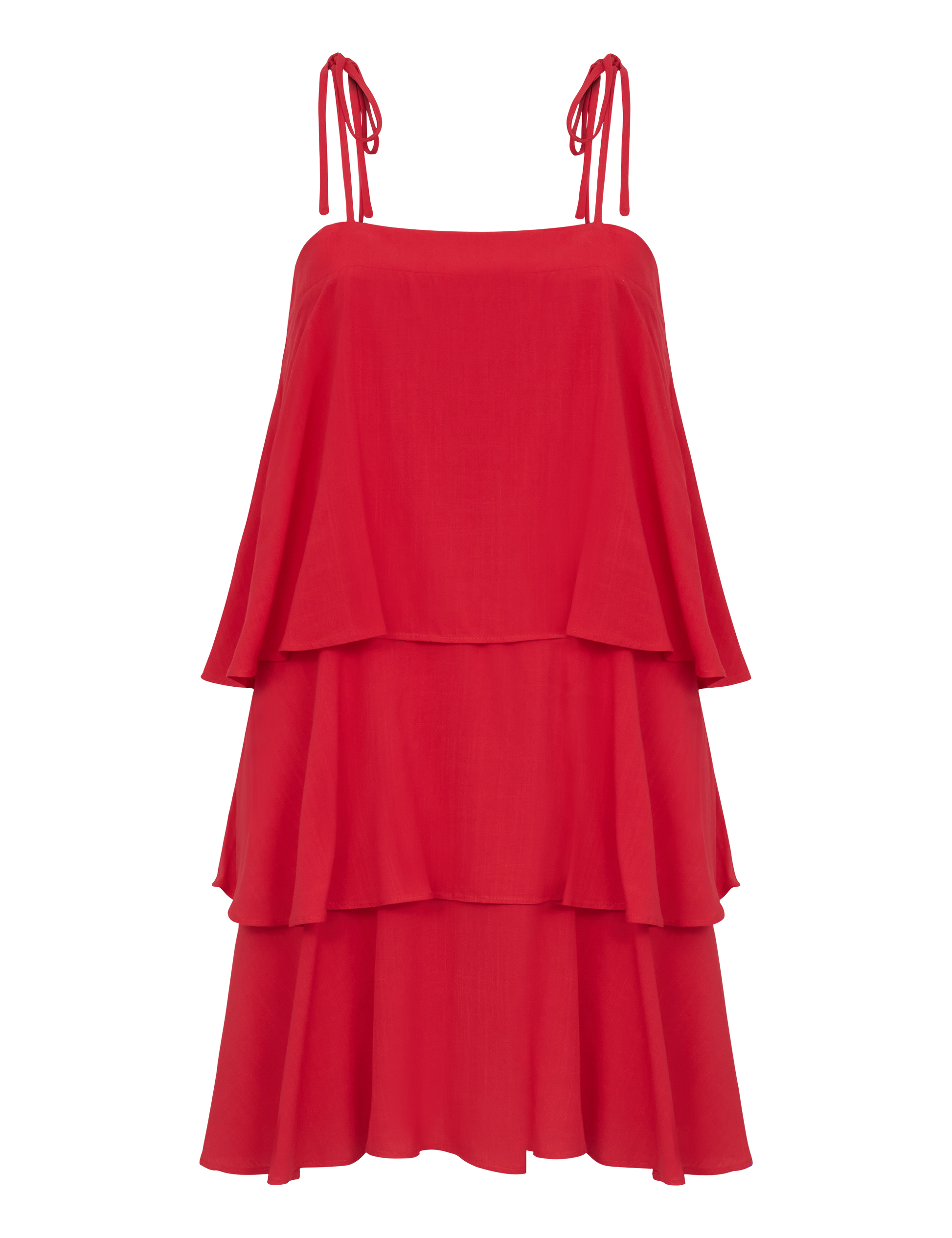 Vestido curto confeccionado em viscose com toque e aspecto de linho. Possui forro. Maxi babados em camadas. Fechamento por botão esmaltado. Possui tiras fininhas e bem delicadas pra você amarrar nos ombros. Um look perfeito pra curtir os dias e noites quentes de verão sem abrir mão do estilo!