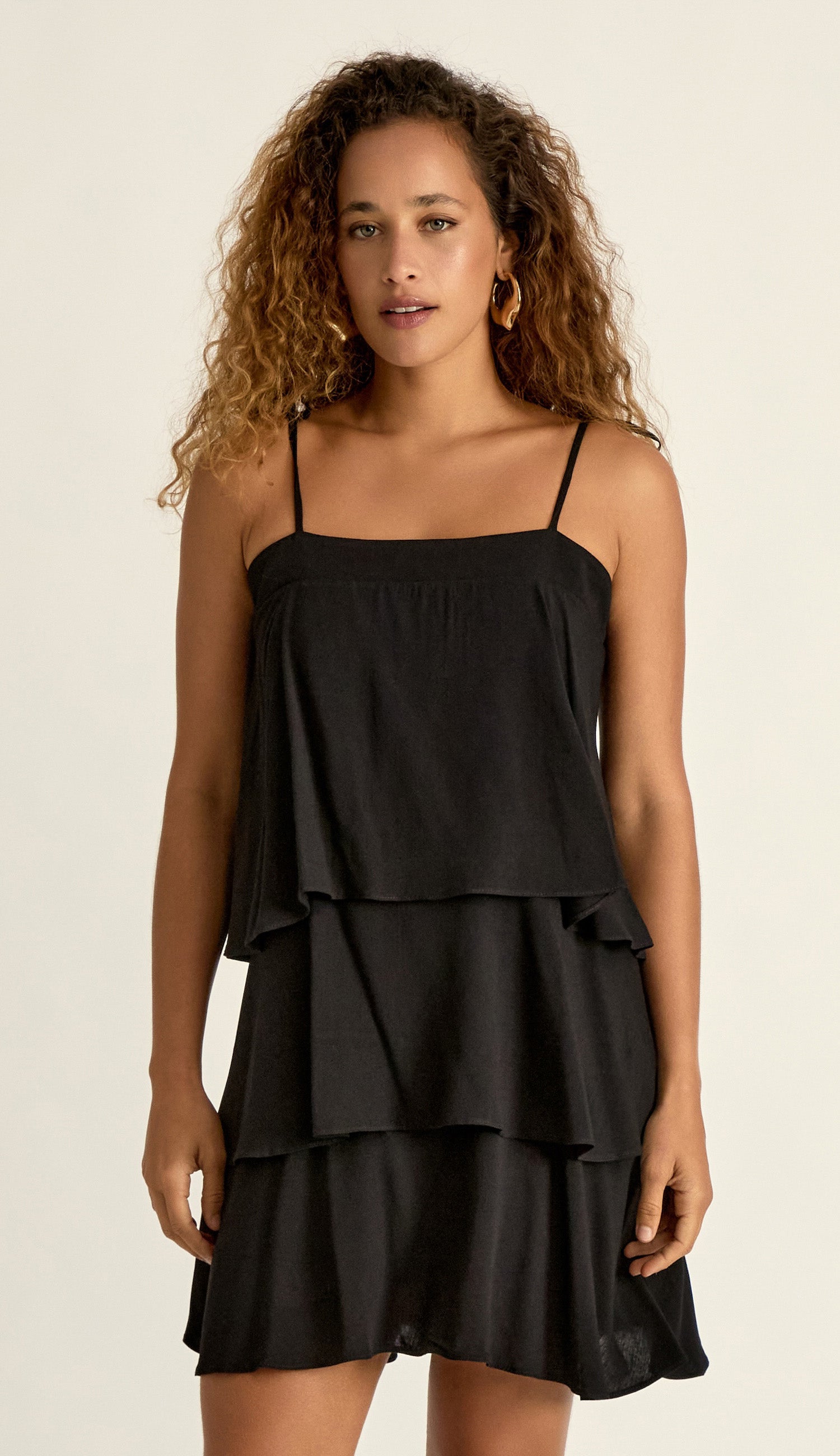 Vestido curto confeccionado em viscose com toque e aspecto de linho. Possui forro. Maxi babados em camadas. Fechamento por botão esmaltado. Possui tiras fininhas e bem delicadas pra você amarrar nos ombros. Um look perfeito pra curtir os dias e noites quentes de verão sem abrir mão do estilo!