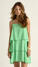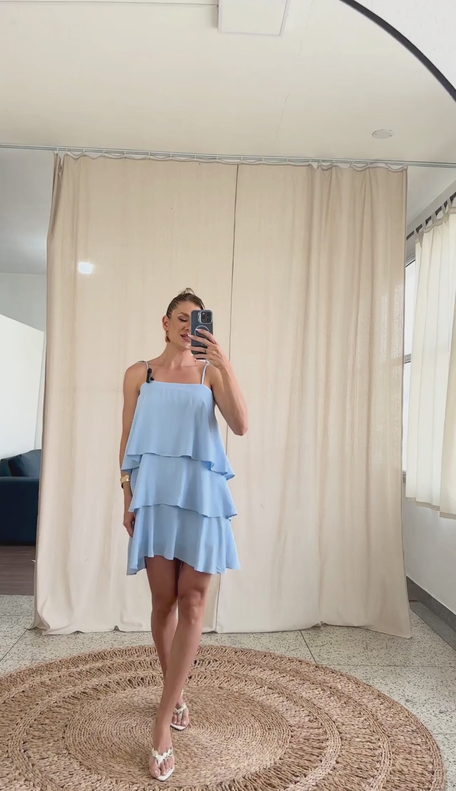 Vestido curto confeccionado em viscose com toque e aspecto de linho. Possui forro. Maxi babados em camadas. Fechamento por botão esmaltado. Possui tiras fininhas e bem delicadas pra você amarrar nos ombros. Um look perfeito pra curtir os dias e noites quentes de verão sem abrir mão do estilo!