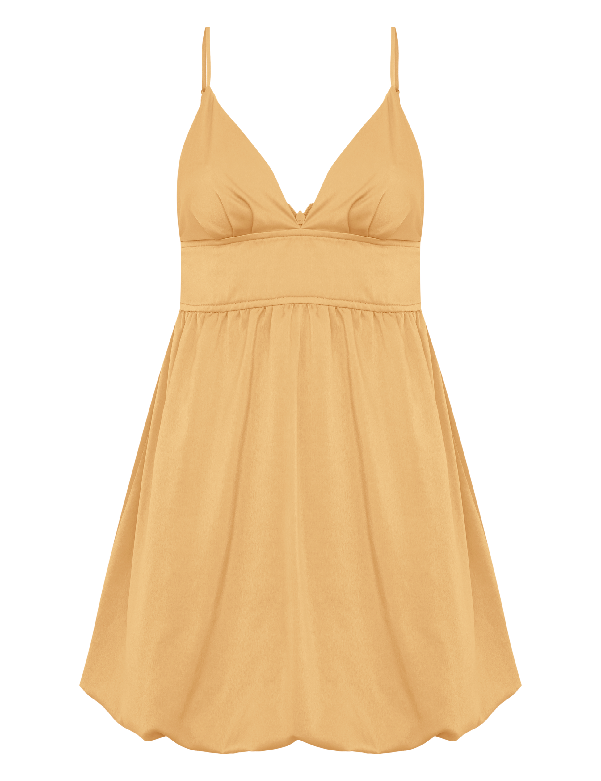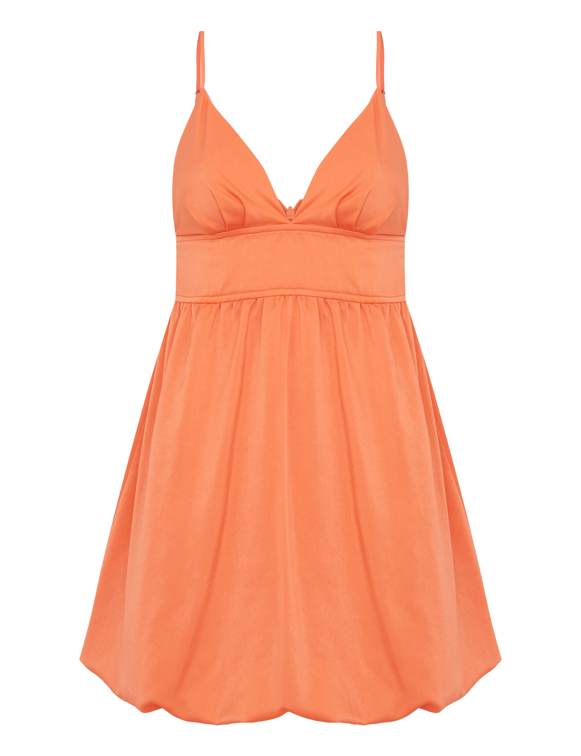 Vestido curto confeccionado em alfaiataria acetinada com forro na saia. Possui decote em V com franzidos e tecido duplo pra não ficar transparente, alcinha reguláveis, pala pespontada logo abaixo do busto, saia franzidinha com elástico interno na barra que dá um efeito balonê e fechamento traseiro por zíper invisível.