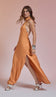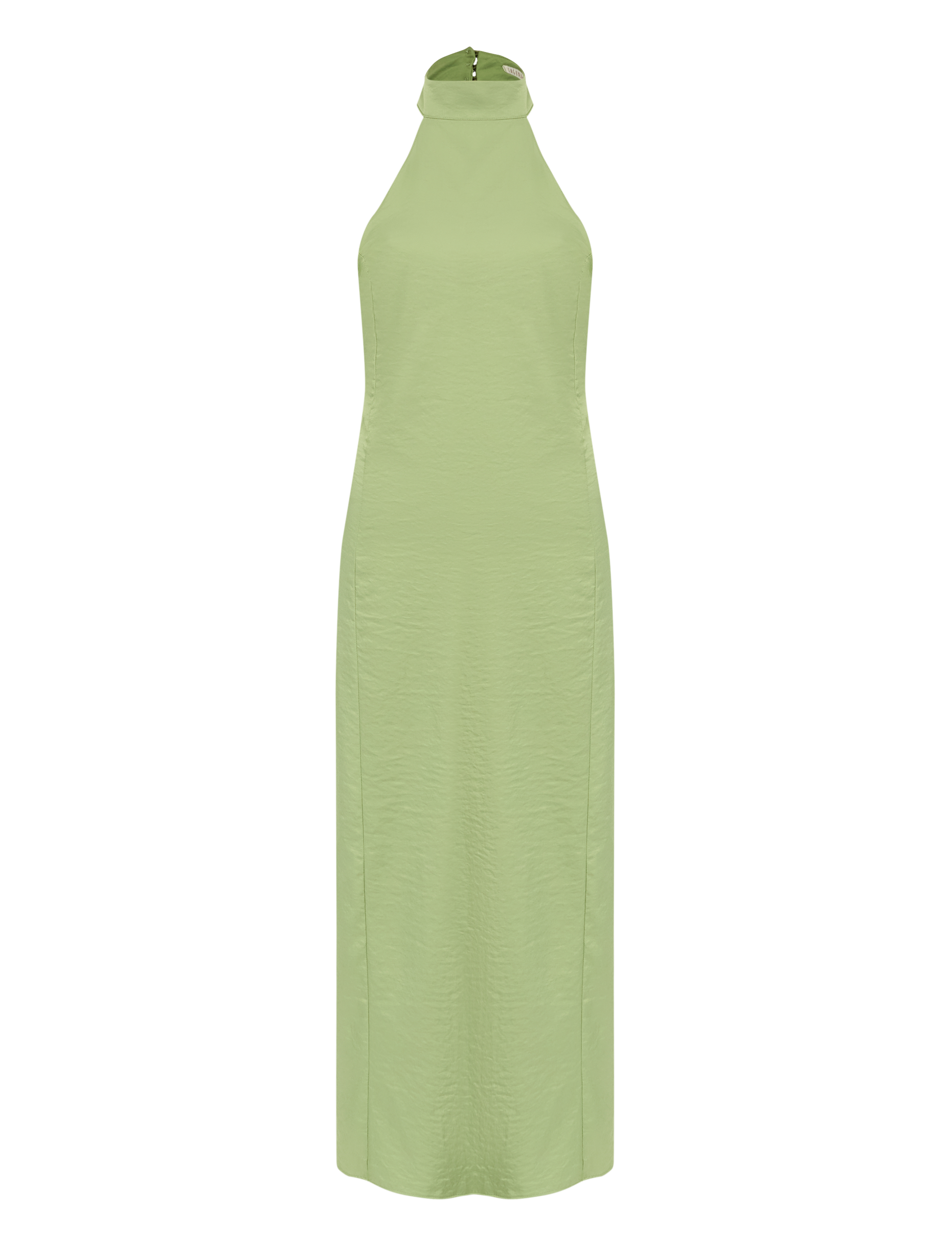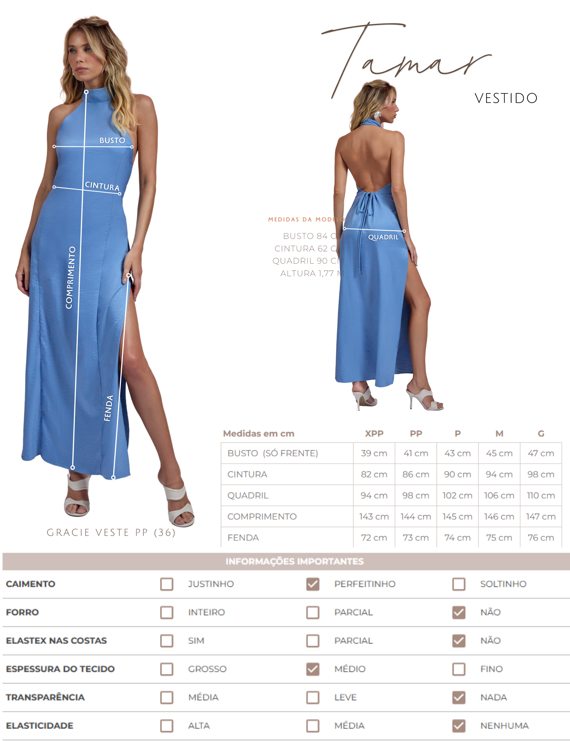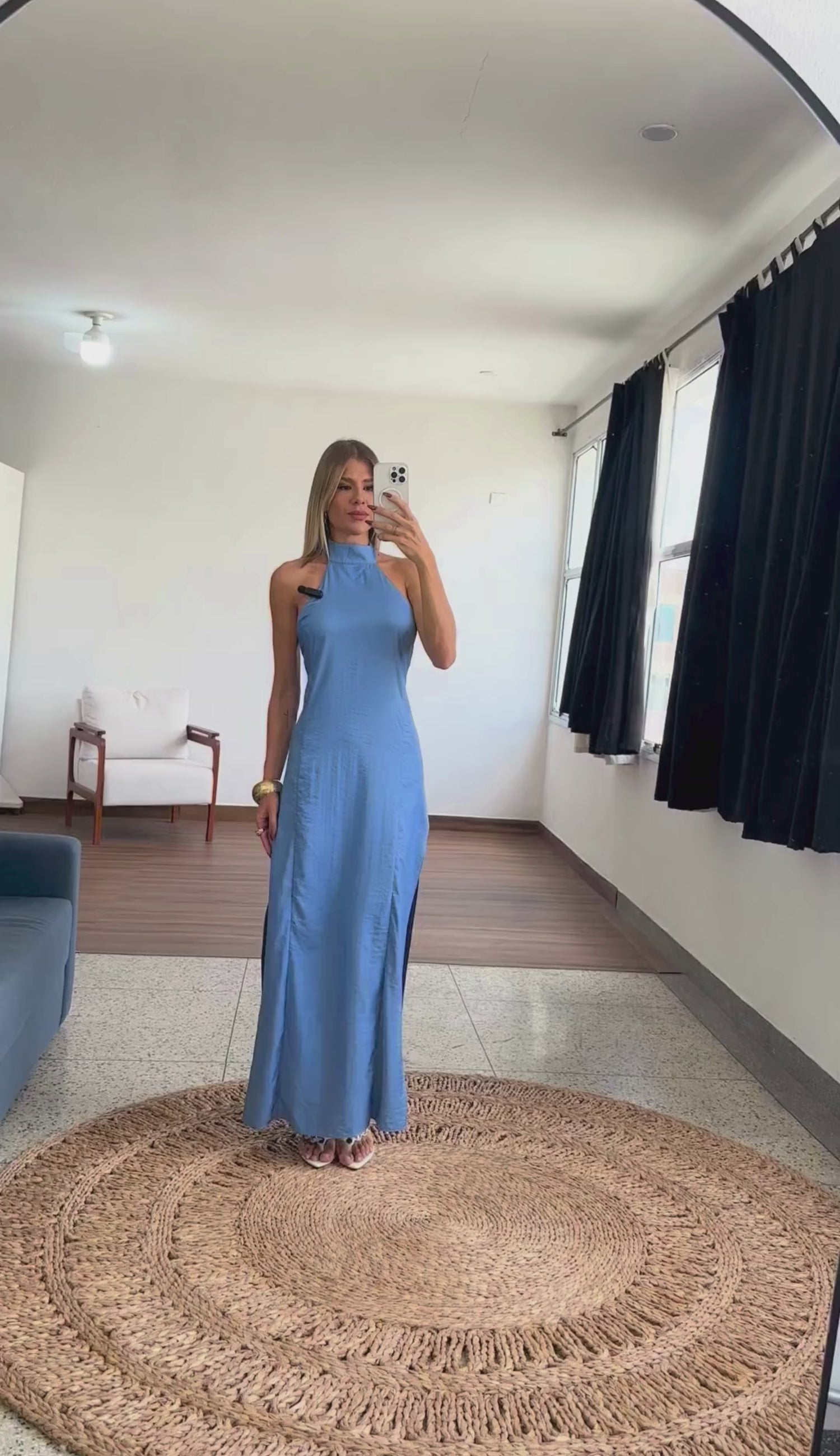 Vestido longo frente única confeccionado em crepe de alfaiataria encorpadinho. Possui decote halter, modelagem soltinha, recortes que modelam a peça, lindo decote nas costas, fendas laterais na saia e fechamento traseiro por por botões esmaltados na gola e tirinha embutida nas costas para ajuste do decote e amarração.