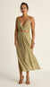 Vestido midi com forro, confeccionado em viscose com toque e aspecto de linho. Possui decote em V, alças finas reguláveis e fendas laterais. Todo o charme vai para o nó tanto na frente quanto nas costas, deixando uma abertura nas laterais. O fechamento é lateral por zíper de metal no busto e zíper invisível na saia.