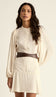 Vestido curto confeccionado em crepe com forro. Possui mangas longas com pregas nos ombros e elástico nos punhos. Fechamento frontal por botões forrados. Abertura nas costas, gola redonda e recorte na saia.