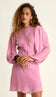 Vestido curto confeccionado em crepe com forro. Possui mangas longas com pregas nos ombros e elástico nos punhos. Fechamento frontal por botões forrados. Abertura nas costas, gola redonda e recorte na saia.