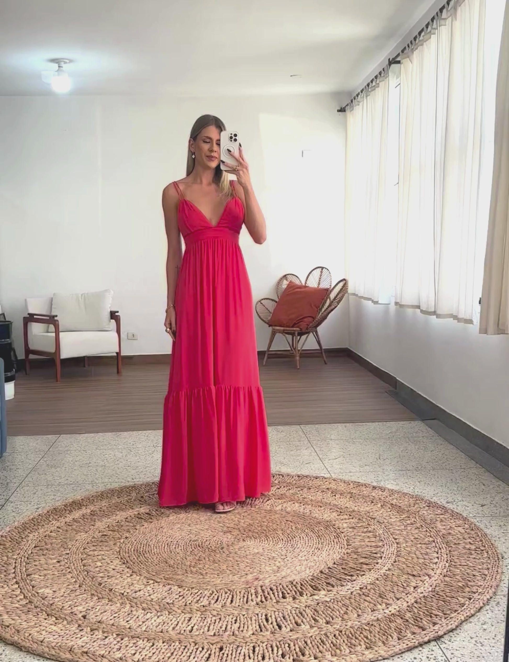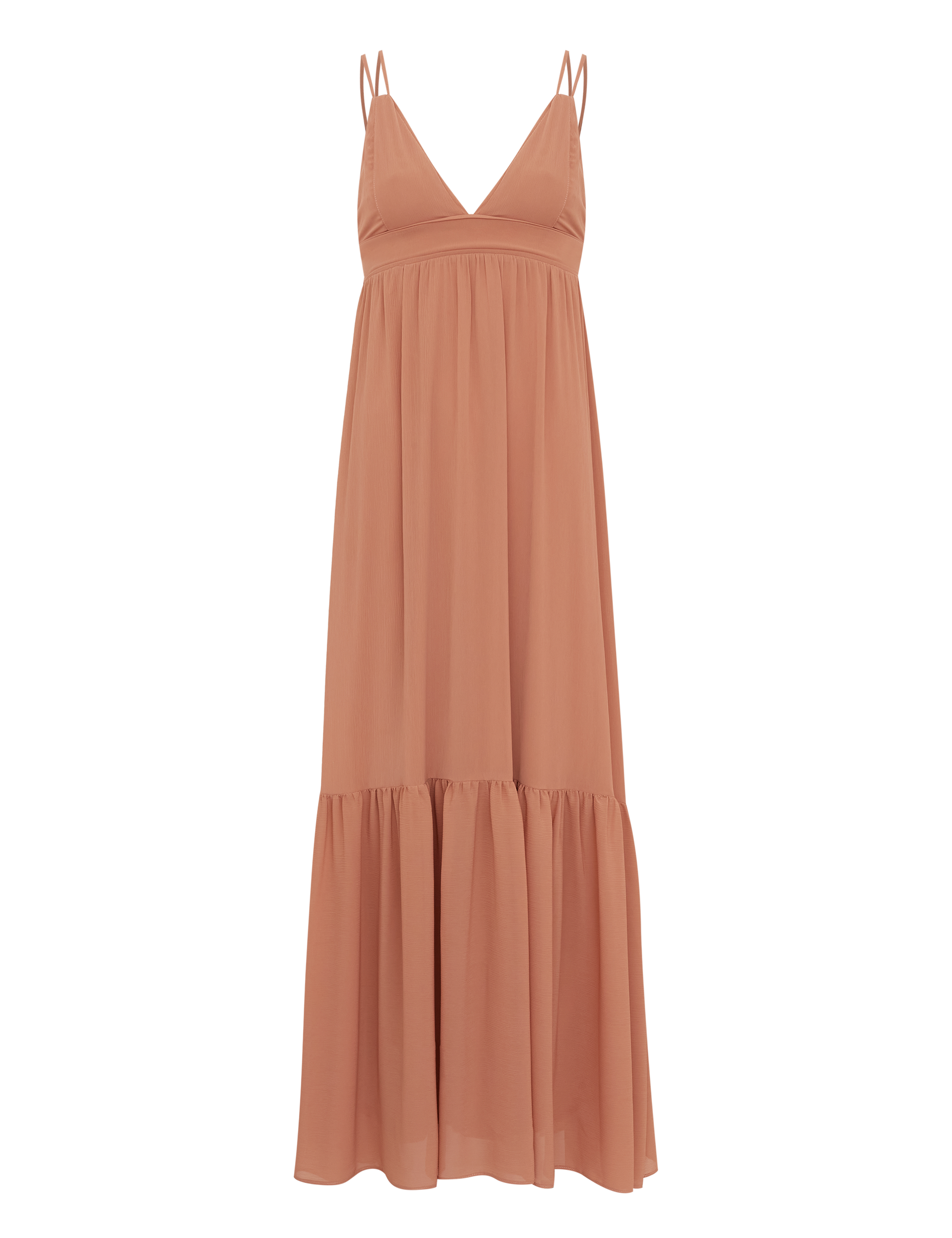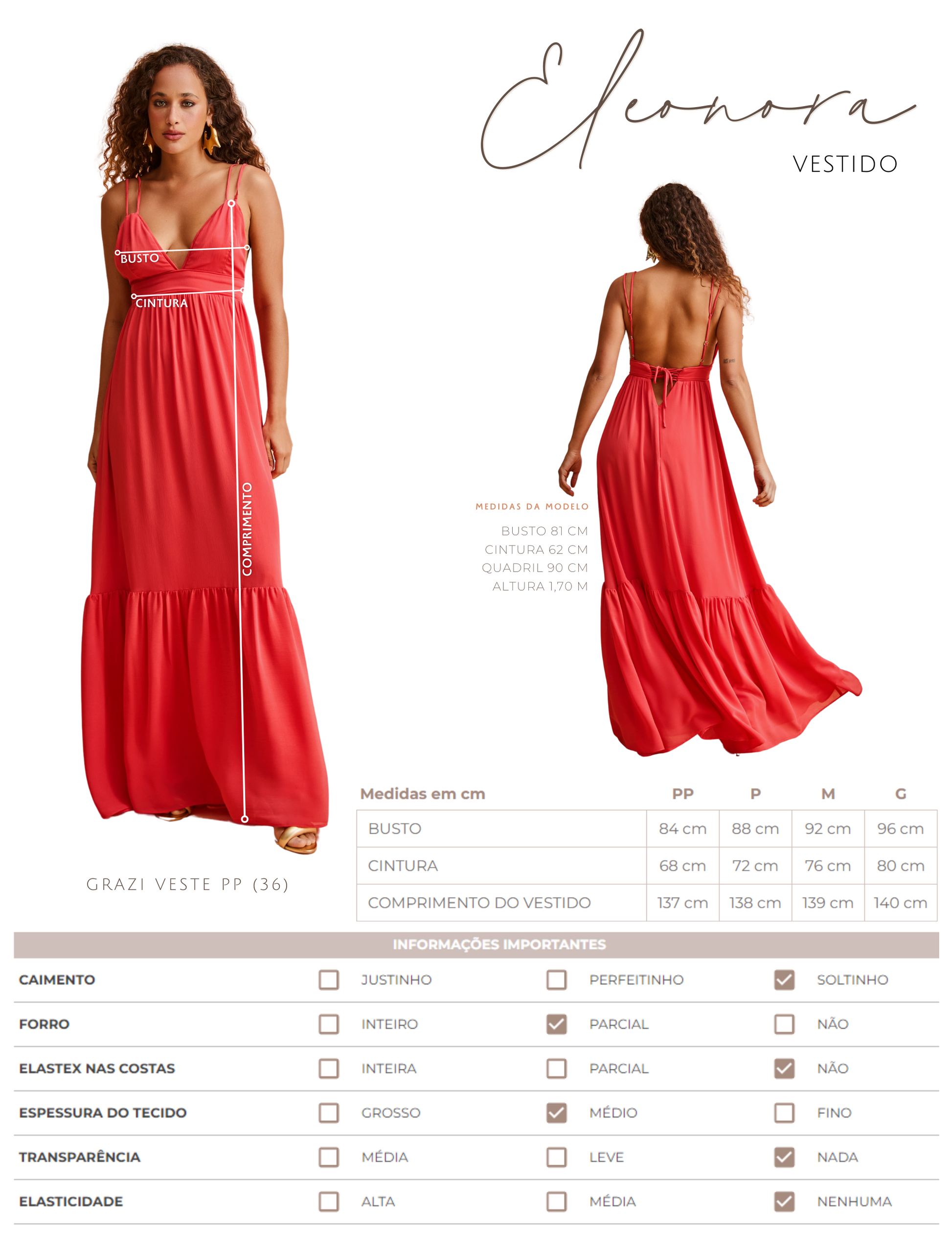 Vestido longo confeccionado em crepe leve texturizado com forro na saia. Possui decote em V com tecido duplo no busto para não ficar transparente, alcinhas duplas reguláveis, fechamento traseiro por tirinhas transpassadas para ajuste e amarração e zíper invisível, pala logo abaixo do busto com detalhes em vivo, franzidinhos na cintura e saia ampla com recorte franzido também.